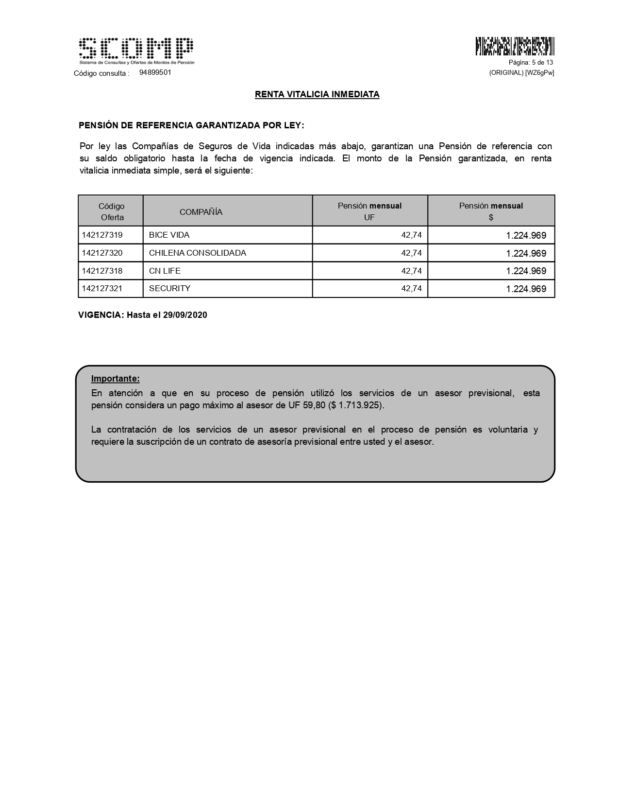 Aquí se indican las fechas de vigencia del Certificado de Ofertas y del Certificado de Saldo. Si cuentas con Pensión de Referencia Garantizada, se indicará la fecha de vigencia para Aceptar.