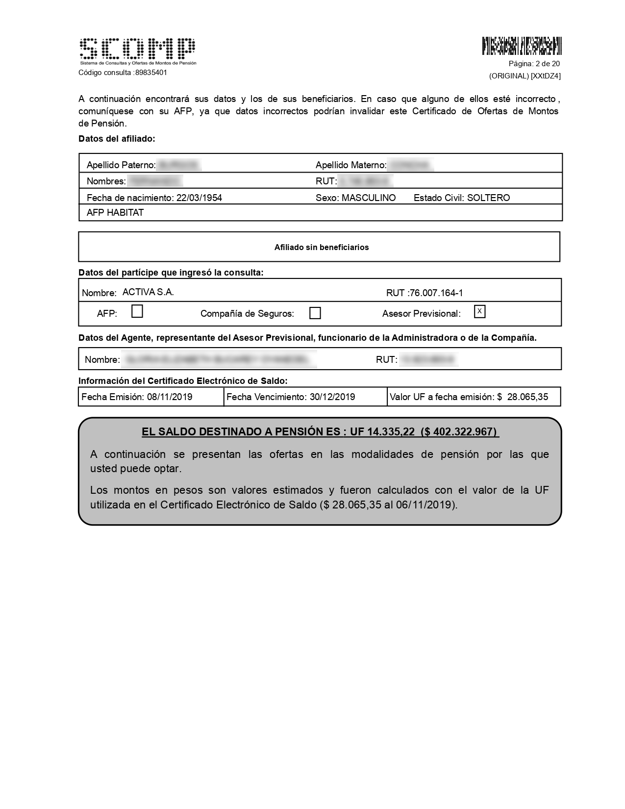 Esta es la primera página del certificado de ofertas. En ella encontrarás información como el tipo de pensión, la fecha de emisión y el período en que las ofertas se encuentran vigentes. |
