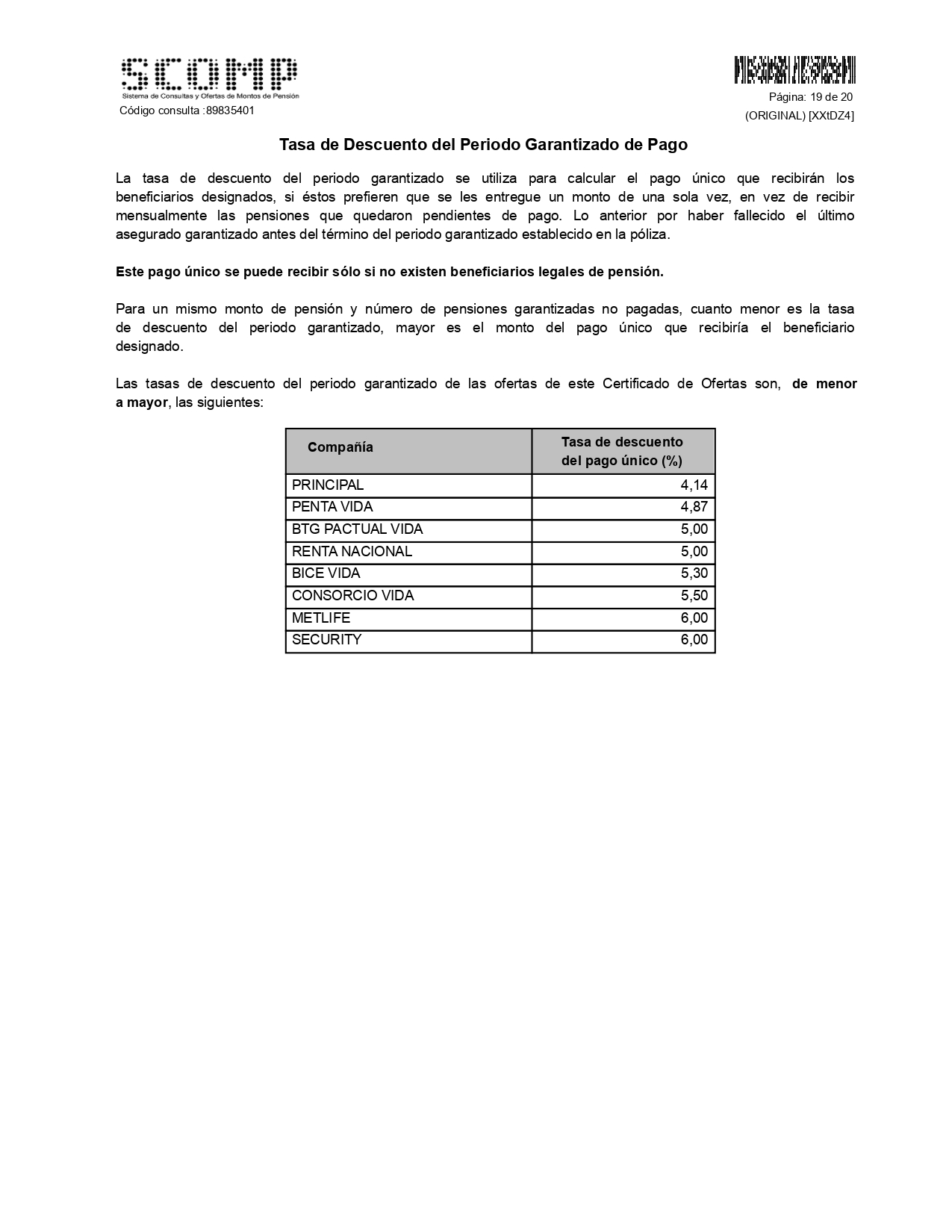 Esta sección presenta las tasas de descuento del período garantizado de pago informadas por las compañías de seguros de vida cuyas ofertas se presentan en el Certificado de Ofertas. Dicha tasa corresponde a la tasa de descuento que aplica la compañía de seguros de vida en caso de que los beneficiarios designados opten por la entrega de una sola vez de las pensiones garantizadas que quedaron pendientes de pago. |