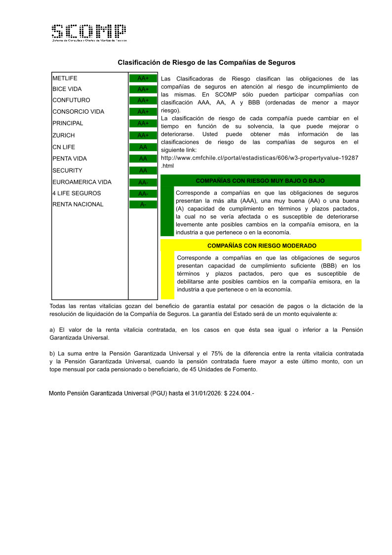 En esta sección encontrarás las ofertas de renta vitalicia efectuadas por las compañías de seguros de vida, conforme a lo que solicitaste en la Solicitud de Ofertas. Las ofertas se presentan clasificadas por Modalidad de Pensión, en el siguiente orden: 1. Renta Vitalicia Inmediata2. Renta Temporal con Renta Vitalicia Diferida3. Renta Vitalicia Inmediata con Retiro ProgramadoA su vez, en cada una de estas modalidades de pensión, las ofertas se presentan en diferentes cuadros de ofertas, conforme a las condiciones especiales de cobertura solicitadas por ti en la Solicitud de Ofertas y/o si dichas ofertas incluyen o no algún tipo de excedente de libre disposición. Dentro de cada uno de estos cuadros, las ofertas se presentan en forma descendente por monto de pensión, es decir, en el primer lugar aparece la oferta de pensión de la compañía que presenta el monto de pensión más alto para esa modalidad de pensión y condiciones de cobertura señaladas en cada cuadro. En caso de igualdad de monto entre más de una compañía de seguros, se presenta en primer lugar la compañía que tiene la mejor clasificación de riesgo. Dicha clasificación se presenta en la sección “Clasificación de Riesgo Compañías de Seguros de Vida”, al final del Certificado de Ofertas. |